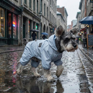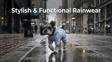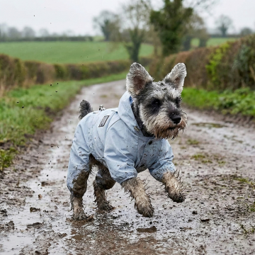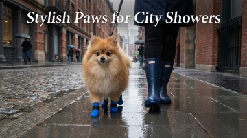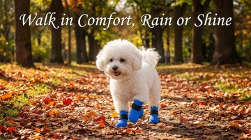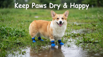 以图中的防水狗狗雨靴带背带为元素,户外可调节防水裤,适合散步远足,设计6张跟防水狗狗雨靴带背带有关的图,可以适当加一些英语文字点缀一下,比例 「16:9」