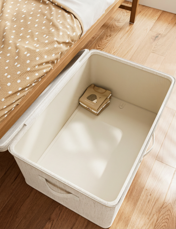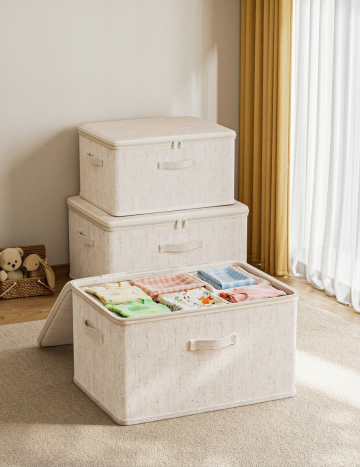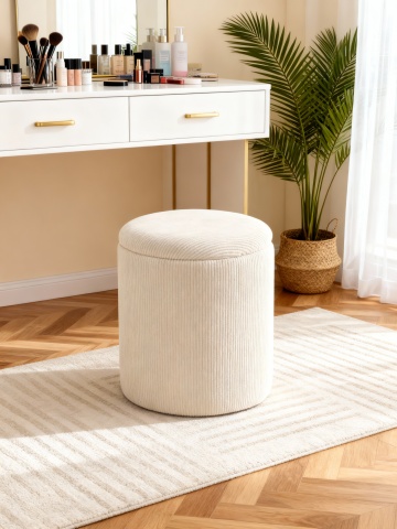 主体: 浅米色灯芯绒材质的圆柱形储物凳,凳盖(仿木纹顶面 + 同面料包边)掀开置于旁侧;储物凳内露出浅绿色恐龙毛绒玩具、米色毛绒小抱枕; 环境: 简约轻奢家居场景 —— 背景是浅米色墙面 + 白色踢脚线,地面为浅色木纹地板,左侧露出金色金属家具框架; 风格: 高清写实,光线柔和均匀,色调干净明亮,突出物品的精致轻奢感。