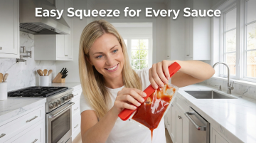 以图中的食品酱料袋挤压器为元素,适用于厨房,欧美女人使用便携式管状挤压辅助工具,适用于乳液、酱料、宠物食品等,设计6张跟食品酱料袋挤压器有关的图,英语,比例 「16:9」