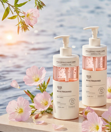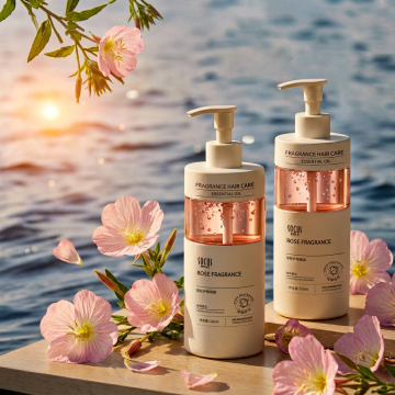 洗发水海报,两瓶浅蓝色透明液体洗发水瓶,带有白色按压泵头和白色标签,标签上有黑色文字“洗发水”和金色装饰,瓶身放置在石头上,石头下方有柔软的沙子,旁边点缀贝壳,整体采用清新的浅蓝色调,柔和的侧光照明,营造出自然、有机、纯净的氛围,背景蓝天白云,画面具有清晰的视觉层次,突出产品主体,光影效果细腻,水面有清晰的倒影,质感写实,设计简约自然
