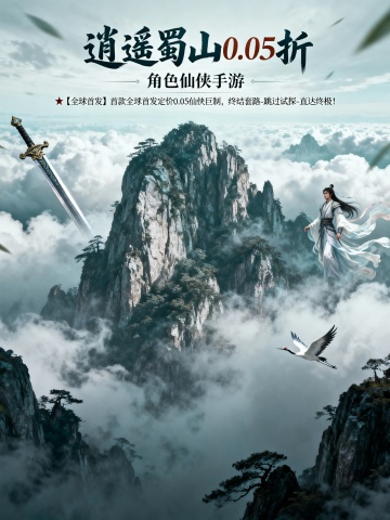将以下文字生成3张宣传图片 :‘逍遥蜀山0.05折’为正标题“角色仙侠手游”为副标题 3张图片福利字不一样 ★【全球首发】首款全球首发定价0.05仙侠巨制,终结套路-跳过试探-直达终极! ★【超值特惠】首充只要0.03元,在线免费送VIP15 ★【御剑飞行】剑鸣震碎千山寂,瞬息已过万重峰,完成任务免费送-青空飞剑 ★【养龙寺】额度大放送每日免费获得3000打金,最高可达30000打金 ★【千倍爆爽】解锁特权即可十倍提升魔王爆率,最高1000%掉率提升 ★【专属额度】击杀魔王每日解锁海量提现额度,仙玉免费拿