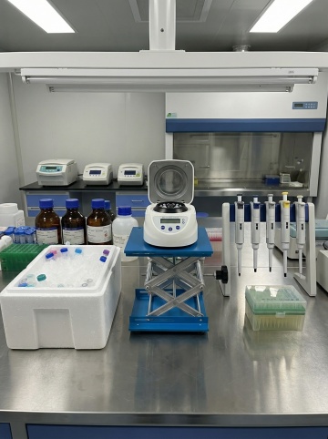 极简主义构图,全景视角下的未来生物实验室,纯净的白色与冰川蓝构成的无菌空间,墙面采用无缝纳米陶瓷板拼接,地面是反光率达95%的超白玻璃材质,顶部悬浮着呈几何阵列排列的环形LED光源,光线均匀地洒落在所有表面。左侧是模块化悬挂式试剂架,透明亚克力容器中装着梯度蓝色的生物试剂,下方嵌入式实验台配备隐藏式智能控制面板。中央区域放置着一台六边形结构的量子分析仪器,金属外壳呈现细腻的哑光钛白色。右侧墙面上的生物安全柜采用隐形门设计,与墙面融为一体。整个空间无任何视觉噪音,连空气都仿佛凝固在绝对静止中,只有试剂瓶上的分子结构标签在微光下隐约可见,完美平衡了科技冷感与空间美学,为内容展示提供极致洁净的背景画布。
