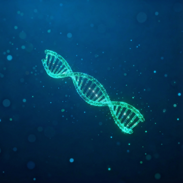 3D渲染风格的生物医学微观背景,以紫色和蓝色为主色调,呈现出高度写实的细胞与分子结构。画面中心是一个半透明的蓝色细胞膜包裹着深紫色细胞核的细胞,悬浮在纹理粗糙、布满小孔和凸起的紫色细胞表面上。周围有多条螺旋状的DNA链,呈现出蓝紫色渐变,有的缠绕在细胞表面,有的向背景延伸。背景为渐变的浅蓝色,营造出深邃、神秘的科学氛围。整体光影柔和,细胞表面有细腻的高光和阴影,突出立体感和材质的颗粒感。构图采用近景特写,主体清晰,背景元素逐渐虚化,形成自然的景深效果,展现出微观世界的精密与奇妙。