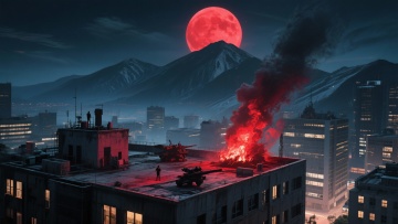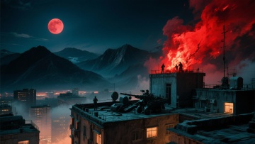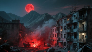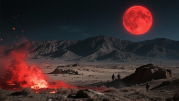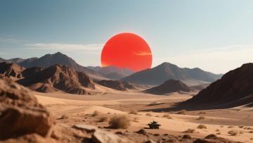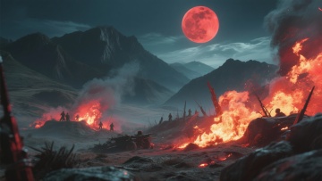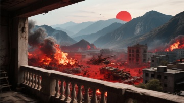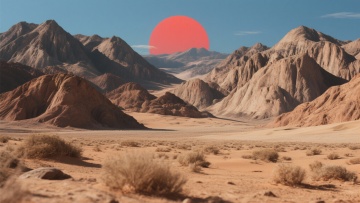 写实,荒野沙漠战场,群山,太阳,红色,近景构图,氛围燃,细节丰富,素材多样,16:9,不要人物,生成2张