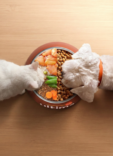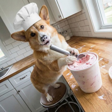 一只戴着金黄色烤吐司切片做成的猫脸面具的小狗,吐司面具边缘略呈焦黄色,表面有细密的烤痕纹理,中间剪出两个圆溜溜的黑色猫眼睛轮廓和一个小巧的粉色三角形猫鼻子,面具两侧有三角形的猫耳朵形状,小狗脖子上系着一条蓝色的领巾,领巾正中间有一个煎蛋造型的装饰,蛋黄呈橙黄色,蛋白为白色,小狗有着蓬松的白色和浅棕色相间的毛发,背景是灰色的沙发和浅色的墙壁,整体画面呈现出温馨、可爱、略带幽默的氛围,光线明亮柔和,对焦清晰,细节丰富。