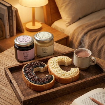 生成5张更加贴合生活的场景,图片融入度更高一点,场景中可以有吐司面包或者其他糕点,但是不要改变产品原样。