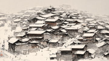 水墨晕染的雪覆古城,工笔细绘飞檐翘角,浮世绘式俯瞰视角,静谧中透出古典中式韵味,朦胧意境如诗如画。