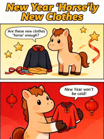 卡通风格插画,拟人小马萌趣互动,喜庆糖果与福袋点缀,漫画分镜展现元旦甜蜜氛围,融合可爱感与节日祝福。