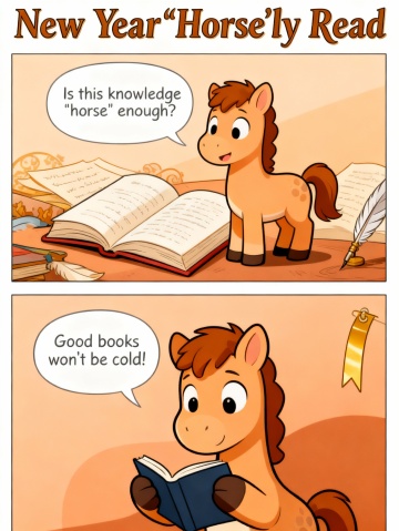异形两格漫画分镜,上方主标题艺术字“新年‘马’上读”,第一格是一只卡通小马在书本旁边,周围搭配翻开的书页、羽毛笔等装饰元素和“这知识够‘马’?”气泡文案,第二格是一只卡通小马两只马蹄捧着书本阅读,旁边搭配金色书签小元素和 “好书不冷场!”气泡文案,整体是淡暖橙色 + 棕色渐变底色。