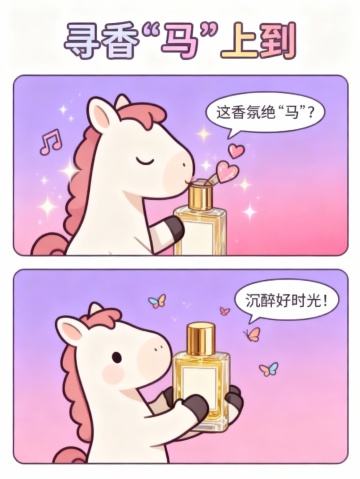 可爱感十足的拟人小马,梦幻粉紫渐变背景,插画风漫画分镜设计,搭配双关语文案,营造浪漫香氛体验。