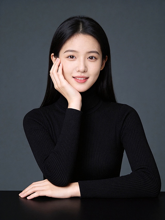 参考第一张图保留人物脸型、年龄等特征生成职场韩系肖像照,清新甜美风格的女性肖像写真,聚焦人物柔和气质,竖幅(纵向构图),50mm标准焦段,中近景(覆盖头部、肩部及部分胸部)参考第二张图人物占位和比例,人物占画面约70%,头部发型完整,人物居中,居中构图,左右留少量空间,平视视角(与人物视线平齐),深炭灰色中领修身针织短袖(袖口直角开口设计),温婉清新+柔和亲切;自然舒展正面姿态,颈部线条舒展,肩部自然下沉;嘴角轻轻微笑,视线直视镜头,整体姿态松弛无紧绷感;发质柔顺,带轻微蓬松感;伪素颜淡妆,清透奶油肌肤质(均匀白皙+通透自然光泽),水润感,质细腻,水润通透,呈现自然原生肤质.轻量眼妆提亮轮廓,淡珊瑚粉色唇妆(唇形饱满柔和);柔和布光,面部光影过渡自然,眼部带清晰眼神光,发丝边缘有轻微轮廓光,整体光比低;影棚柔光,光线均匀柔和,面部阴影极淡,肤色调清新柔和,高清细腻,呈现自然真实的清新简约氛围;零噪点降噪。去除人物之外的所有元素,32K画质,高分辨率商业肖像画质,低噪点,色彩还原准确,低饱和柔色调滤镜,整体色调偏暖,色彩对比度低;哑光质感无缝纯色背景,颜色为浅裸粉色,表面平整。严格按照第一张图内容生成。详情