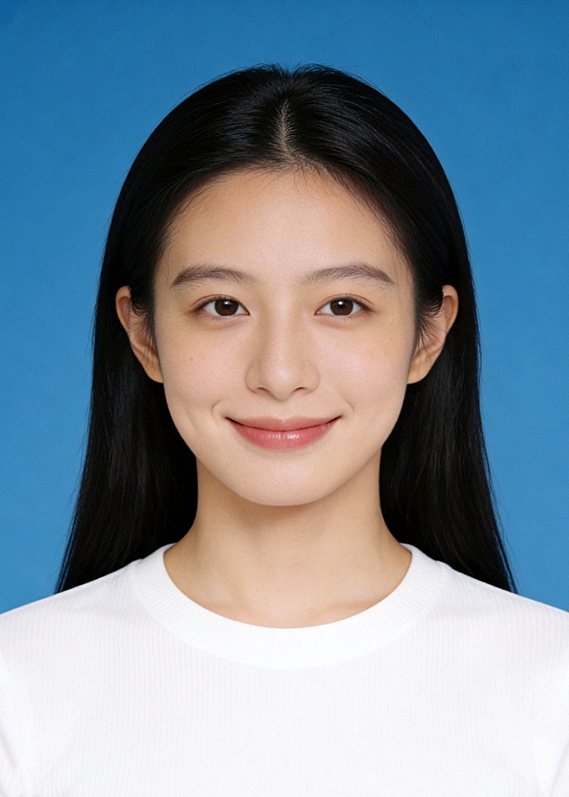 一个女生,工作形象照,蓝色背景,白色衬衫详情