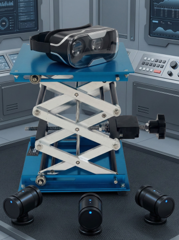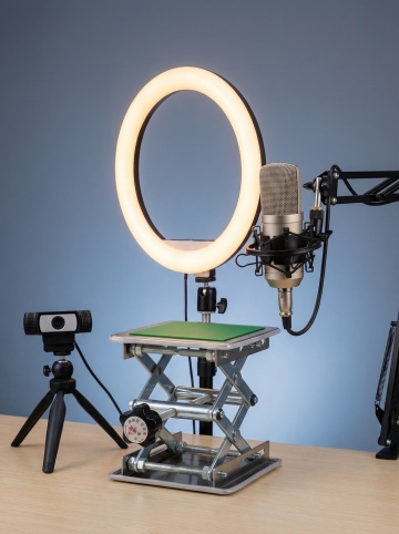 专业摄影棚中,一个升降台作为产品拍摄台,其上是一枚精致的珠宝,周围有环形灯和反光板,用于拍摄广告级特写比例3:4