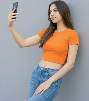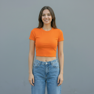 一位年轻亚洲女性的全身人像,人物正面站立,双手背在身后,姿态自然,表情平静。采用高清商业摄影风格,柔和均匀的正面光源,白色纯色背景,画面干净简洁,主体突出。人物展示完整,包括发型、面部表情、身形姿态。穿搭改为简约时尚风格:上身是一件浅灰色的宽松短款卫衣,搭配一条高腰深蓝色直筒牛仔裤,脚穿白色运动鞋,整体休闲舒适,符合日常穿搭展示需求。