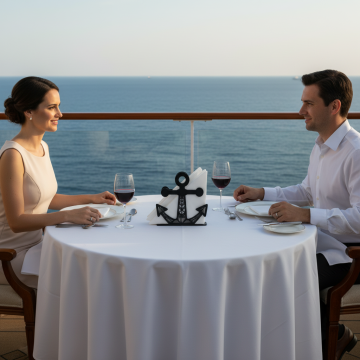 夜幕下的邮轮甲板,女性身着黑色晚礼服手持红酒,都市天际线与水面倒影交织,光影流动间尽显奢华浪漫与现代都市的优雅格调。