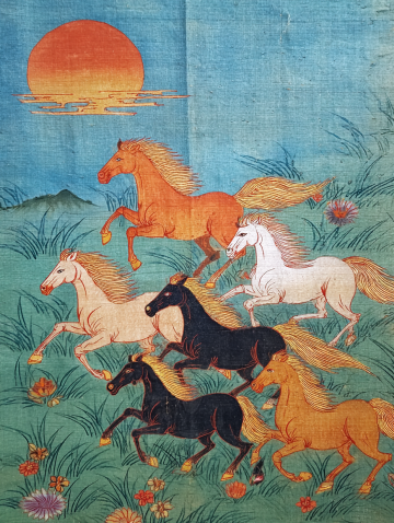 工笔风与重拟物结合,白驹腾云,飞天舞袖,红金背景衬托出浓郁的国潮风与喜庆感,融合岩彩质感与鎏金细节,呈现梦幻唯美的中式古典意境。