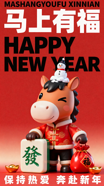 软3D风卡通马拟人形象,身着国潮红衣,头顶雪人,手持“发”字麻将与福袋,喜庆可爱,传递新年祝福。