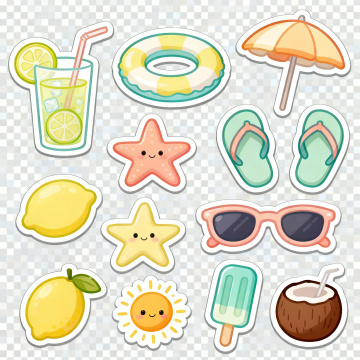 清新插画风手账贴纸,菠萝、救生圈、贝壳、拖鞋与沙滩球,夏日度假元素。