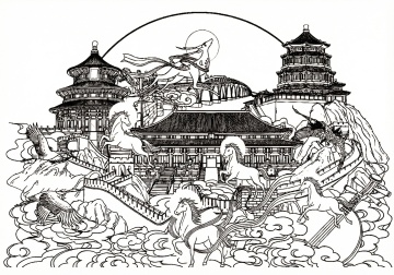 古典中式工笔风,鎏金建筑悬浮云端,超现实主义梦幻场景。