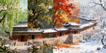 【春季】远景镜头,淡绿色的水彩幻化成轻柔的薄纱弥漫整个背景,无数嫩绿与翠绿交织的叶子舒展脉络,与娇柔粉白、鹅黄浅紫的樱花、郁金香相互缠绕,晨露在花瓣尖闪烁,阳光透过新叶洒下碎金光斑,色调以嫩芽绿为主,点缀粉白与鹅黄,营造万物复苏的纯净童话感。 【夏季】远景镜头,青碧色的水彩幻化成厚重的绿纱笼罩画面,深绿与墨绿的梧桐叶层层叠叠,其间点缀着朱红、明黄的荷花与石榴花,露珠在叶片上滚动折射强光,阳光透过繁密枝叶形成星点光斑,色调以浓绿为底,跳跃着朱红与明黄,展现盛夏蓬勃的生命力。 【秋季】远景镜头,琥珀色的水彩幻化成轻盈的纱幔铺展背景,金黄、橙红与赭石色的枫叶、银杏叶交织飘落,其间点缀着米白的雏菊与深紫的秋菊,晨雾凝结的露珠泛着冷光,夕阳透过疏朗枝叶洒下暖橙光斑,色调以琥珀金为主,融合橙红与赭石,呈现秋日成熟的诗意童话。 【冬季】远景镜头,雾白色的水彩幻化成朦胧的纱幕笼罩画面,苍青与墨绿的松针、柏叶坚韧挺立,其间点缀着殷红的山茶与雪白色的蜡梅,冰晶凝结在枝干上折射寒光,月光透过薄雾形成淡蓝光斑,色调以雾白为底,映衬松柏青与山茶红,营造冬日纯净而坚韧的童话意境。