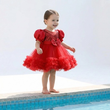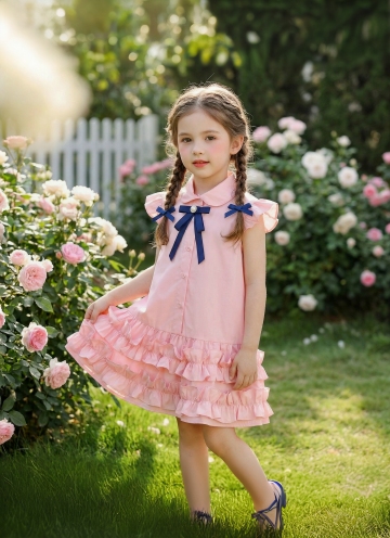 将图2的裙子分别穿在图1的两个小女孩身上,保持裙子的面料质感和款式不变,再将小女孩的鞋子换成甜美可爱的沙滩凉鞋,4K高清图