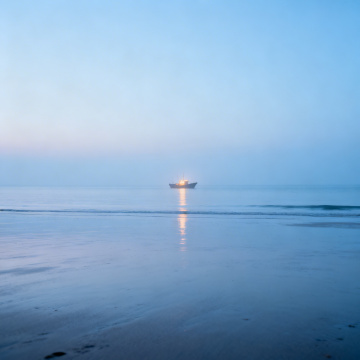 胶片风实景海景,日落余晖洒于岩滩,光影交织,静谧宽阔,水纹清透,质朴自然,柔光映照,舒适悠然。