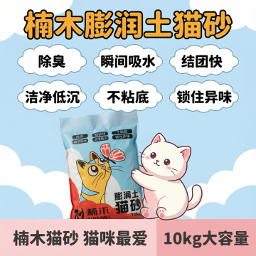 帮我做10张拼多多主图,卖点可写结团快不粘底 猫咪超爱用 10kg大包装 囤货更划算 膨润土猫砂瞬间吸水+锁住异味 楠木膨润土猫砂:结团快/不粘底/洁净低尘10kg大容量猫砂 除臭结团一步到位 和图二类型一样 多些点缀 不要框