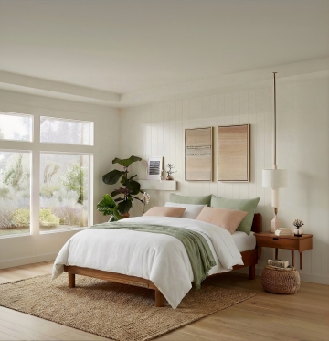 一张现代简约风格的卧室设计图,整体色调为温暖的米白色和浅木色,搭配柔和的自然光线从大窗户洒入,营造出宁静舒适的氛围。房间内有一张铺着白色条纹床单的双人床,床头摆放着简约的床头柜和台灯,床尾处铺着一张米白色的地毯。房间的另一侧是一个白色的梳妆台,上面摆放着一些绿植和装饰品。墙面采用了简约的线条设计,整体空间布局合理,家具摆放整齐有序。