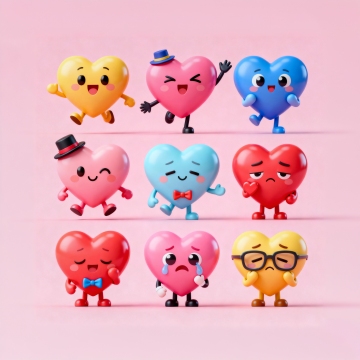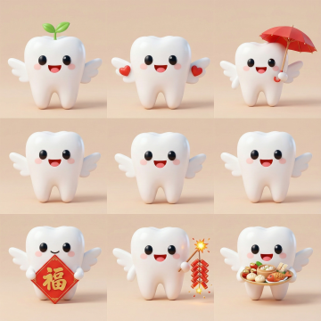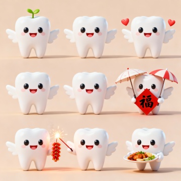 软3D风格一颗牙齿做着不同动作的统一IP插画,并规整排列,这个IP形象为一颗洁白的短体牙齿,它的眼睛圆圆的,嘴巴微笑着,旁边有对稍大点的翅膀,每个元素均有统一纯色背景和圆润3D造型。六个动作分别是:1.头顶顶着一颗小草;2.翅膀上分别有一个爱心;3.打着一把小伞;4.手里拿着红色的“福”字;5.手里点着一个鞭炮;6.手里端着一盘美食。整体色彩明快协调,保持一致的柔和光照效果及自然阴影,呈现出可爱的卡通质感。