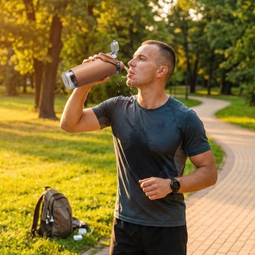 写实风格摄影,一名穿着深色运动背心和黑色短裤的男性正在奔跑的背影,肌肉线条分明,姿态充满动感与力量,跑鞋细节清晰可见,阳光从侧后方照射,在人物身上形成明亮的轮廓光和明显的阴影对比,画面整体色调温暖,以金色和蓝色为主,高清晰度,细腻的质感表现,将原有的乡村道路环境改为清晨的城市滨江步道,地面铺设平整的灰色塑胶跑道,道路一侧是波光粼粼的江面,另一侧是整齐的绿化带和路灯,远处可见城市的天际线和朦胧的晨雾,保持原有的逆光拍摄角度和阳光效果,营造出清新、充满活力的运动氛围。
