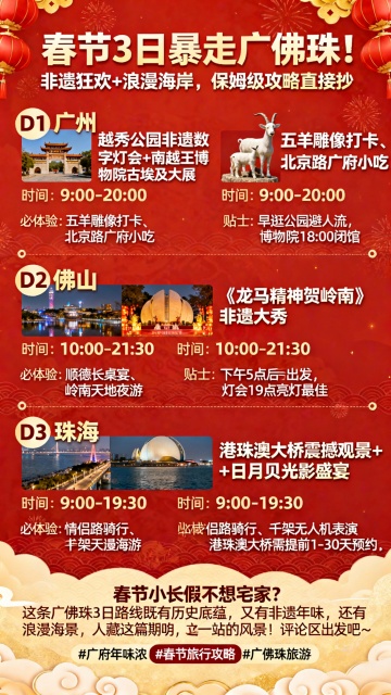 3. 预约:部分非遗体验(如佛山醒狮采青)、热门景区需提前线上预约,建议提前3-5天规划