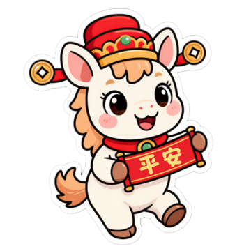 Q版马年动漫IP形象设计,可爱的拟人化小马宝宝,有着蓬松柔软的毛发,圆圆的脸,开心的笑容,可爱的歪着头看着镜头微笑,穿着春节服饰,手上拿着有春节元素的物品,背景为单色红色,整体风格是卡通可爱的插画风,画面高清,细节丰富