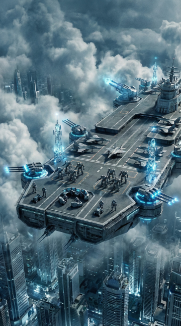 未来主义空中堡垒穿行云层,甲板搭载变形战斗机组,战术机甲群摆出防御阵型,每个机甲群由一个机甲战士控制,三联装等离子炮塔旋转锁定目标,晶格通信塔散发幽蓝光芒,下方超高层建筑群反射着金属冷光。要有好莱坞科幻电影质感