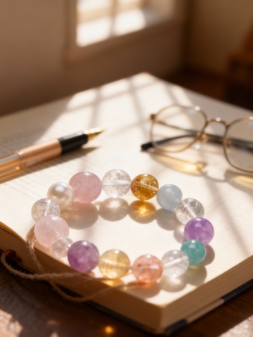 手链缠绕在前景小书上,中景摆放小笔和眼镜,背景虚化阅读角;强光影从顶部阳光投射,影子在书上交织,金黄反射