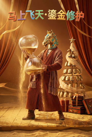 马卡蓝软胶马头头套,彩虹针织卫衣印满小雏菊,腰间“奶油软管精华”当腰带,挤出一朵朵云;舞台是草莓奶油地板,圣诞树由拐杖糖拼成,礼盒是果冻杯,金粉彩糖雨哗哗落;顶部3D膨化糖霜字“马住甜甜·奶盖发光”,泡泡粉天幕+彩虹流苏,LED糖纸旋转灯,全糖去冰8K。,生成3张