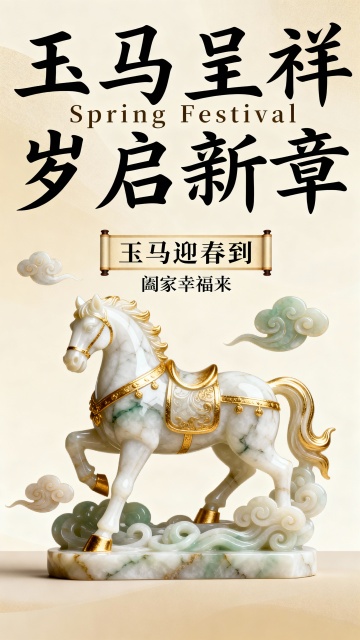 画面视觉中心是剪纸造型的毛绒马(表面装饰银线刺绣梅花纹与几何纹样,昂首衔着红色福字,耳尖缀白绒球)。背景为浅米红渐变底 + 淡红祥云暗纹,融入红墙金瓦、挂红灯笼的庭院元素,角落点缀古松枝。主标题是白色毛绒艺术字 “玉马衔春 2026 纳吉”,背景地面上有 毛绒3D 透视隶书大字 “新春启瑞 福满家门”。