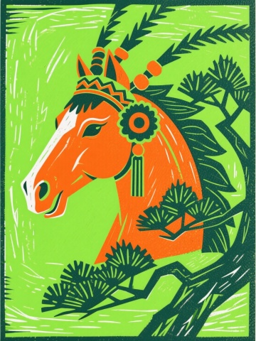木刻画,版画,主体是带有老生纶巾戏曲头饰的棕褐马头(纶巾素雅,缀墨色绒球,神态沉稳),搭配苍劲古松(枝干虬曲,松针茂密),以棕黄为基底、松枝荧光纹为暗纹背景。构图以马头为视觉核心,融入泛黄书卷,点缀戏曲折扇元素,整体色调棕褐、墨、金为主,兼具古韵与国潮感。