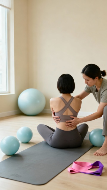 一位亚洲女性正在户外瑜伽垫上做板式支撑动作,双手撑地,身体呈一条直线,双腿伸直并拢,脚尖着地,展现出力量与平衡的美感。她穿着浅棕色运动背心和米白色紧身运动裤,头发在脑后扎成一个低马尾。背景是宁静的自然环境,清晨的阳光透过茂密的树叶洒下柔和的光斑,周围有几棵高大的绿色树木,地面铺着柔软的瑜伽垫,整体氛围清新、宁静、充满活力。画面采用简约的摄影风格,柔和的自然光线,暖色调为主,光影过渡自然,突出人物的肌肉线条和瑜伽动作的优雅,构图简洁,主体明确,给人一种舒适、放松的感觉。