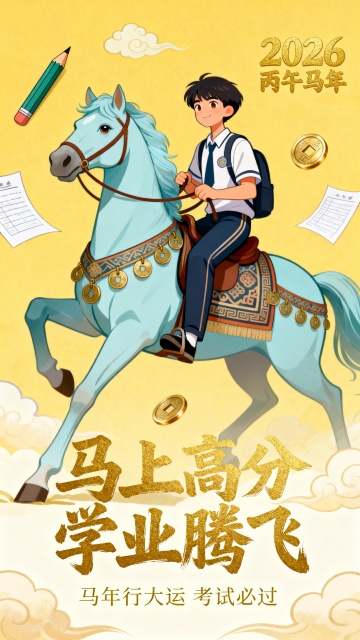 清新扁平插画风,学生与浅蓝骏马结合,铅笔试卷与祥云铜钱交融,暖黄浅蓝配色,营造励志喜庆的马年学业腾飞氛围。