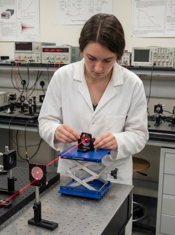 超写实摄影风格,微型精密装配场景。一台小型银色升降台(台面100×100mm)置于防震光学平台上,升降高度显示85mm。台面上固定着一个微型轴承座(尺寸30×30mm),一个直径25mm的圆形水平仪精确放置在轴承座的安装平面上。背景是装配显微镜的目镜,前景散落着M2微型螺丝和精密镊子。冷白光照明,金属表面有细腻的反射,水平仪气泡清晰居中。景深控制:水平仪和轴承座锐利,背景适度虚化。