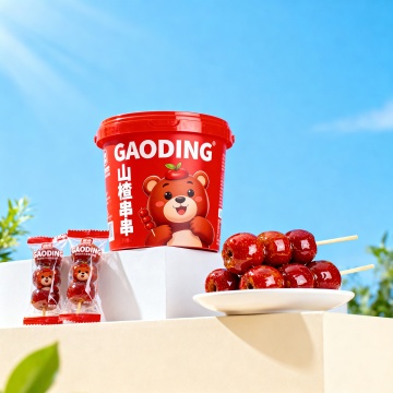 商品广告摄影,低角度仰拍视角,红色桶装儿童山楂串串零食置于简洁的米白色展台上;桶身印有卡通小熊形象,包装清晰显示loog “GAODING”和“山楂串串”等文字;桶左侧摆放同款的山楂串的独立小包装,桶的右侧前摆放着白色小盘子里盛放多颗裹着亮泽糖衣的山楂串(插在小木棍上);背景是明亮的蓝天与少量的绿色植物点缀,整体色调鲜艳温暖,光线柔和通透,商业产品图质感,高细节纹理,8K 分辨率。