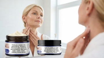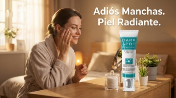以图中的祛斑面霜为元素,温和呵护面部均匀肤色焕亮水润日常护理,设计6张跟祛斑面霜有关的图,比例 「16:9」,语言是西班牙语,欧美女模特