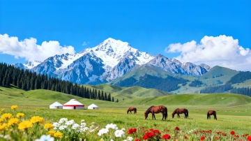 在一片广袤无垠的草原上,远处是巍峨耸立的雪山,山顶覆盖着皑皑白雪,山腰处云雾缭绕,宛如仙境。草原上绿草如茵,点缀着五颜六色的野花,有红色、黄色、紫色等,在阳光的照耀下显得格外鲜艳。近处有几棵高大的树木,枝叶茂盛,投下斑驳的光影。天空湛蓝,飘着几朵洁白的云彩,整个画面给人一种清新、自然、宁静的感觉,充满了生机与活力。