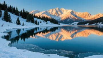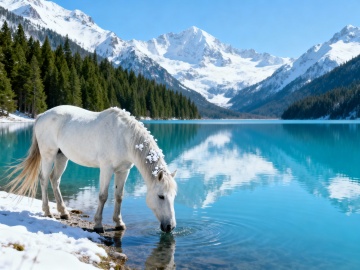 雪湖边白驹饮水,雪山倒影如画,光影交织,清透静谧,油画风中透出梦幻与优雅。