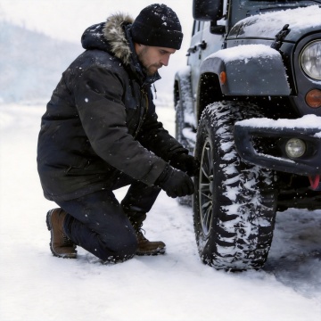 极寒雪原上的黑色越野车在落日余晖中疾驰,实景感与光影感交织,展现现代工业美学的酷炫与体积感,3D风重拟物设计强化动态张力。