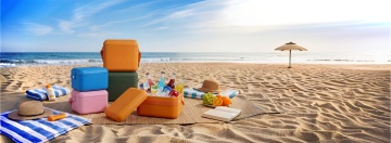 一只手握着一瓶防晒霜喷雾,喷雾正从瓶口喷出,形成白色的雾状。整体画面采用温暖的橙色和黄色作为主色调,背景是明亮的橙黄色天空,点缀着少量白色云朵。防晒霜瓶身主体为柔和的暖橙色,瓶身上有白色的“SPF 50”字样和相关标识,喷雾的白色与瓶身及背景的暖色调形成鲜明对比,营造出温暖、活力的夏日氛围。光线明亮柔和,从斜上方照射,在手和瓶身上形成淡淡的阴影,增强立体感。