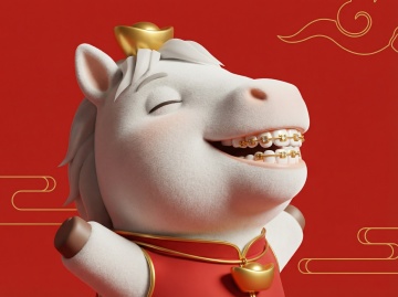 软3D风可爱小马,国潮元素点缀,鎏金元宝与玉佩相映,水彩云雾背景,喜庆吉祥,卡通感十足。