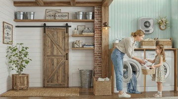 一张现代简约风格的洗衣机产品摄影,主体为一台白色滚筒洗衣机,位于画面中央,洗衣机上方摆放着几瓶不同材质的洗护用品,左侧地面有一个装满白色毛巾的编织篮,旁边有一盆绿色植物,采用柔和的自然光从侧面照射,光线明亮均匀,营造出干净整洁的氛围,具有高清晰度和细腻的质感表现,背景改为充满自然气息的木质阳台,能看到窗外的绿色植物和柔和的阳光洒入,整体色调以白色、浅木色和绿色为主,保持简约、清新、舒适的视觉感受。