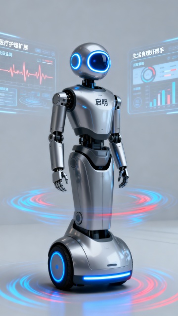 海报中应包含“智启新程,无碍同行”, 海报中展示产品的2个核心功能或优势医疗(护理扩展、生活自理好帮手),还有小标注的立意(在科技与人文关怀交汇的今天,我们始终坚信:技术的终极使命,是赋能于人,尤其是让那些面临生活挑战的群体,拥有更平等、更自主、更富尊严的生活体验。怀着这份初心,我们倾力推出专为残障人士设计的智能生活伙伴——**“启明”人工智能机器人**。它不仅仅是一台机器,更是一位全天候在线的智能助手,一双可延伸的手臂,一对洞察环境的眼睛,一位理解您心意的伙伴,旨在打破障碍的藩篱,照亮自主生活的每一条路径。)