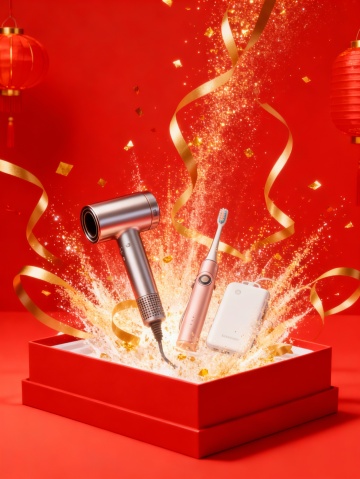 3D卡通拟人小马身披红袍,置身圣诞暖光客厅,霓虹灯字“双旦来袭”闪耀,金属质感剃须刀悬浮手中,喜庆温馨氛围拉满。
